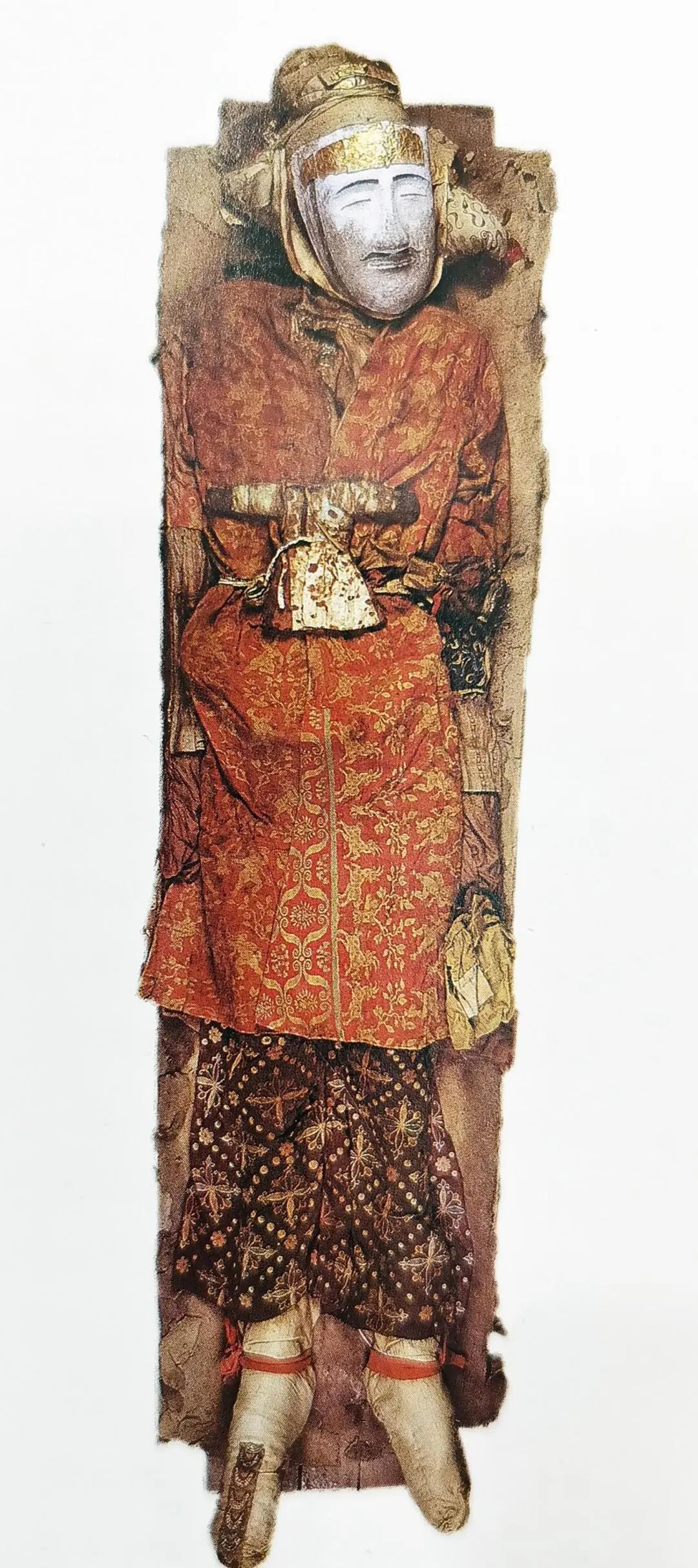 墓主尸身盖淡黄色绢衾,色彩鲜艳如新;面部罩盖麻质面具,表情安详。身着红地对人兽树纹罽袍、淡黄色绢内袍、毛绣长裤,脚穿绢面贴金毡袜。腰系绢质腰带,其上垂挂香囊、帛鱼,位于腰左侧。
