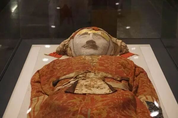 因为气候和埋葬位置的原因,男尸面部、身体都已干缩,呈灰褐色,但即便如此,墓主人浓密的头发,长长的睫毛,立体的五官仍旧可以推测出,墓主相貌堂堂,很有混血儿的相貌风采。