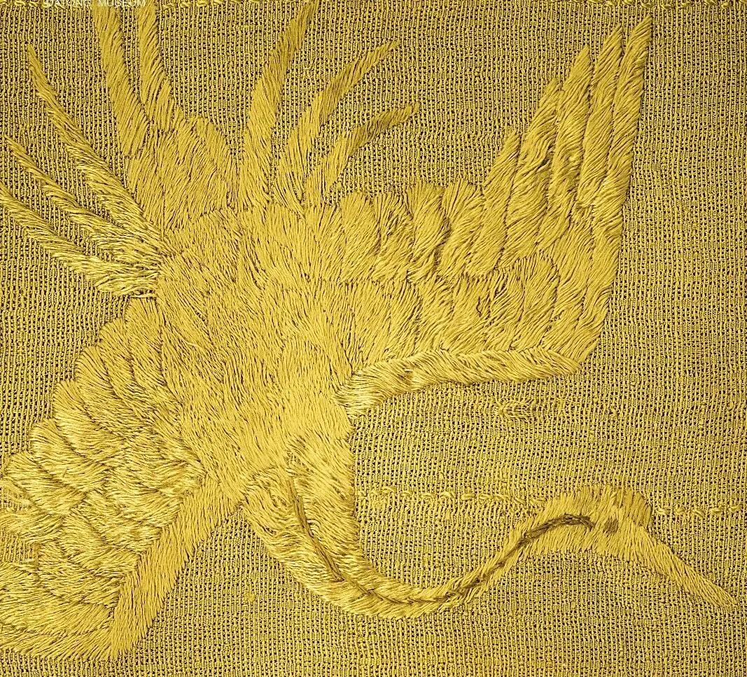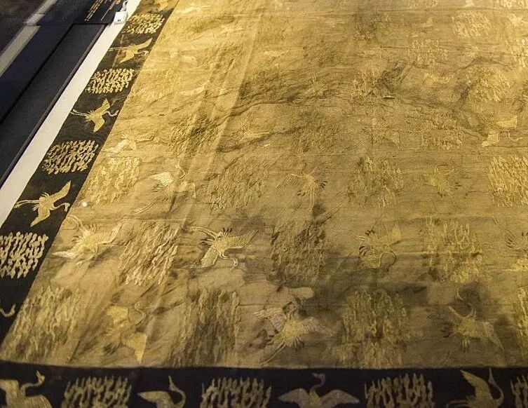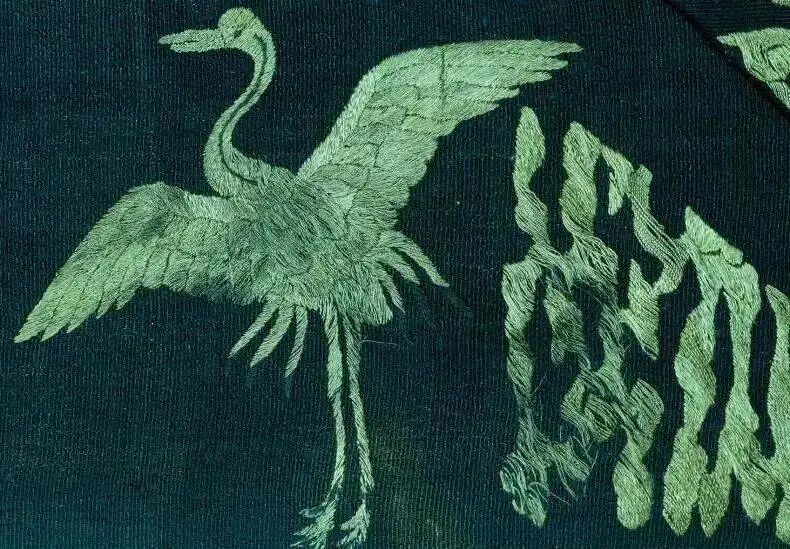 墓主人身上的这件鹤氅特别考究,技法纯熟,丝绣工艺精妙绝伦。整幅鹤氅中部的黄色表面和黑色镶边都是提花罗,并用二经绞罗绣花纹,地部全是用四经绞罗。