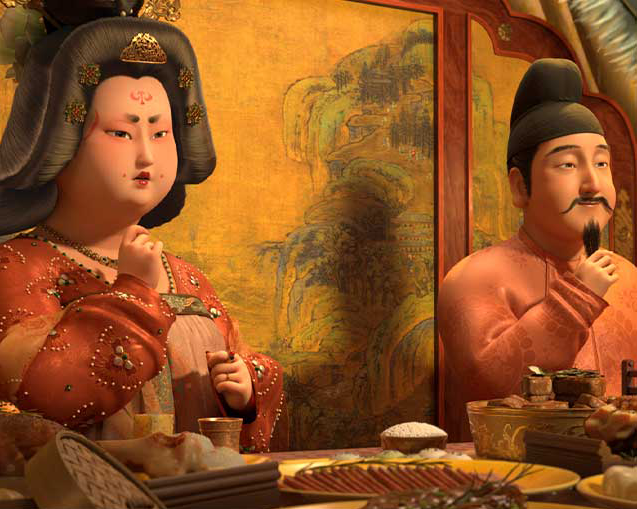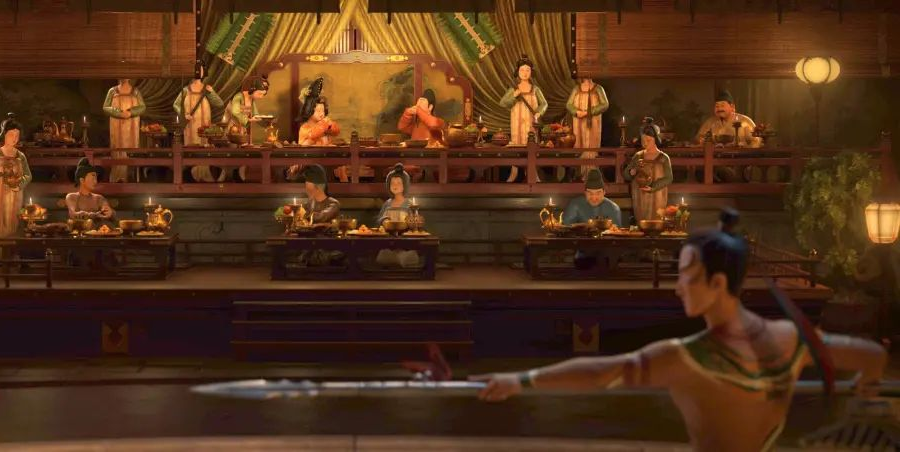最近大火的《长安三万里》画面细节都非常考究,比如李白高适等人衣服的纹饰,玉真公主的头饰项链,还有玉真公主与岐王欣赏高适枪舞时身后的屏风画,100%还原了唐朝画家李昭道的《曲江图》。