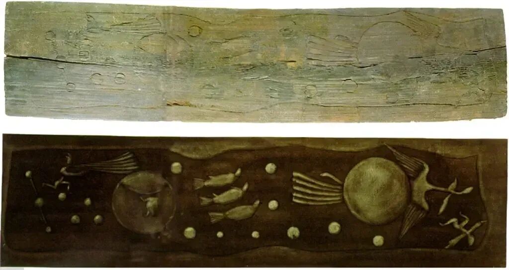 棺材板中,人们发现了一组木刻画,画面包括日月星辰、泗水捞鼎图、舞乐杂技图等内容。特别是这刻着日月星辰的木板,它纵向放置在棺盖上起一定的保护作用。木板一块长188厘米、宽45.3厘米、厚3.5厘米,左方刻有圆日与金乌,金乌的头尾在圆日的两边,上首和右首分布9个小日,左上一人奔跑,推测应为古代传说中的“后羿射九日”。右方刻有圆月,月中有蟾蜍、白兔和半弧形线条,下有一人,将画面连贯起来赏析,大约就是传说中的“嫦娥奔月”。圆月后面分布七颗星辰,其中三颗连成直线,另四颗斜角排列。日月之间有三条鱼形图案。