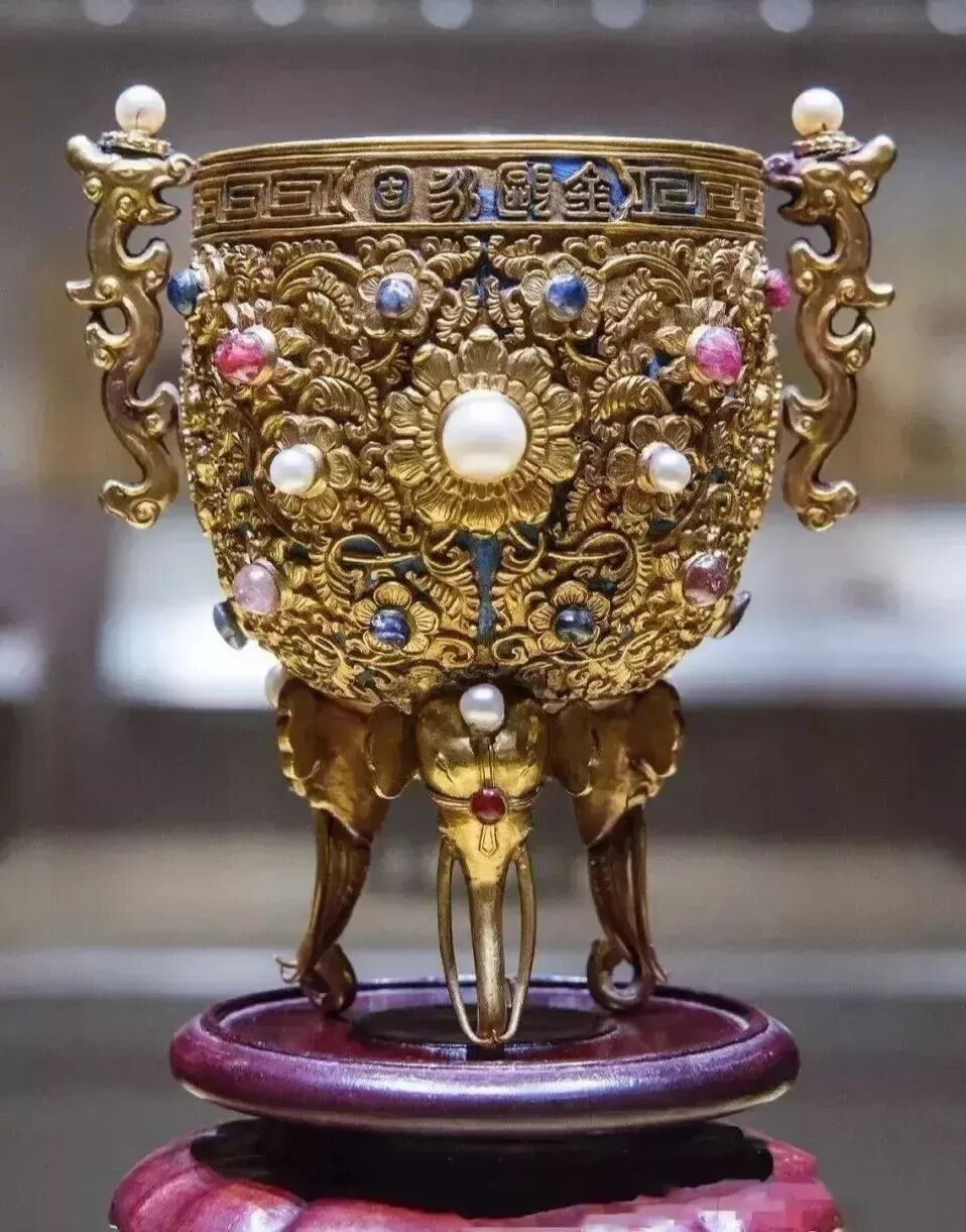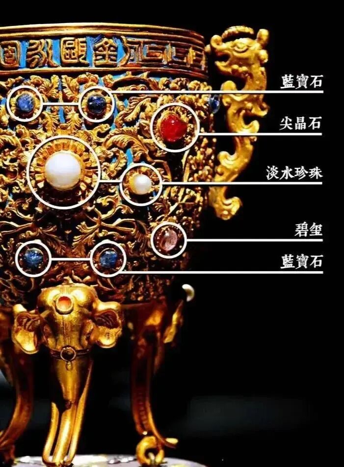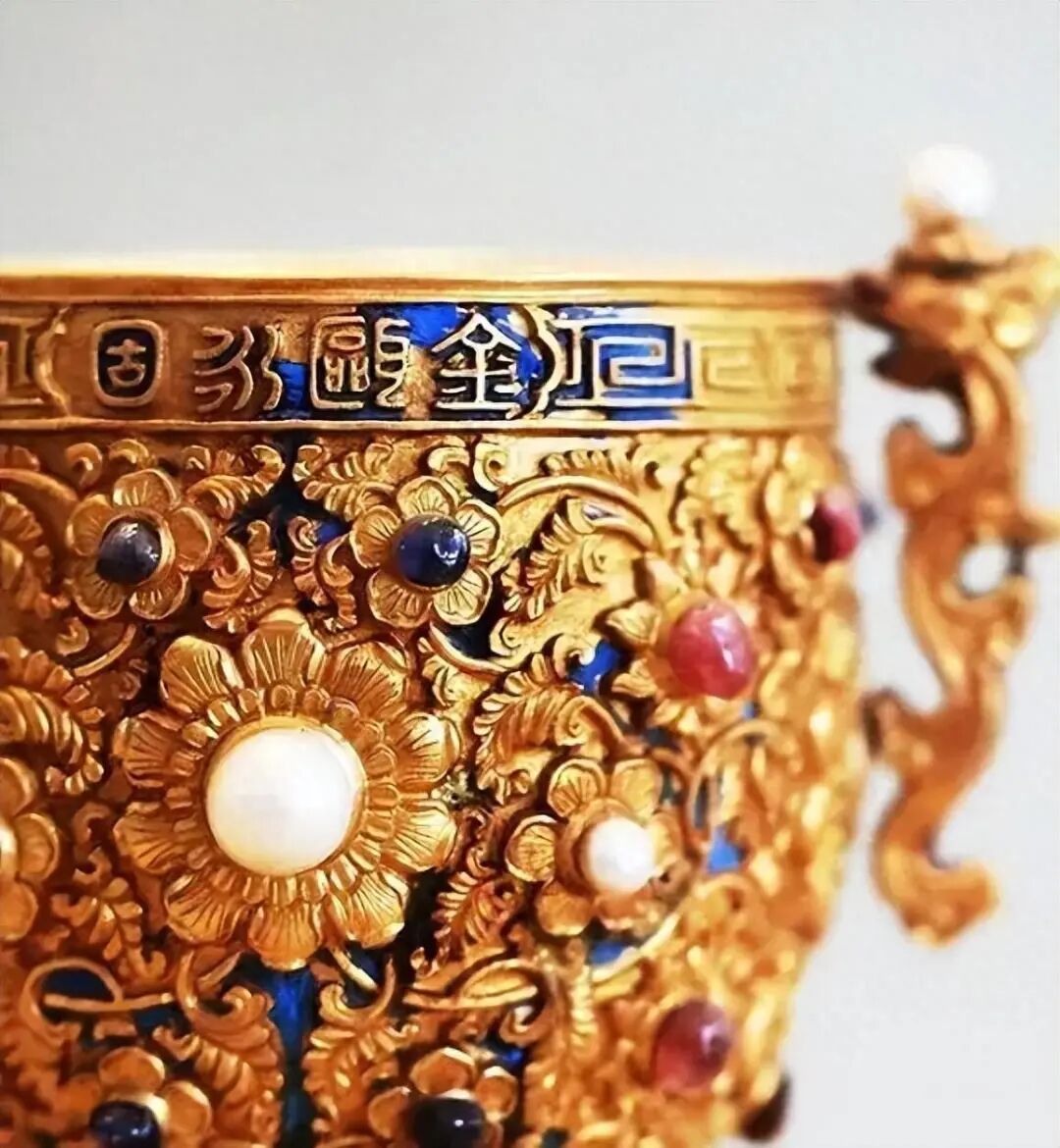 金杯上镶嵌珍珠、蓝宝石、红宝石、碧玺,珍珠象征健康,蓝宝石被当作护身符,红宝石又名照殿红,象征纳福聚财,碧玺又叫“碎邪金”,有辟邪之意。