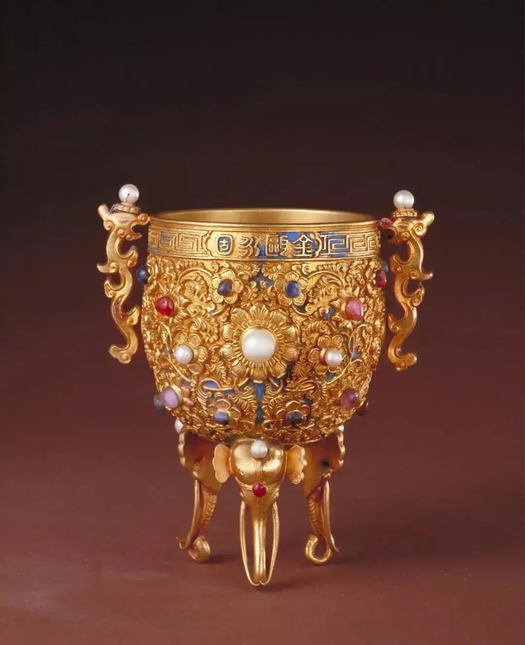 杯以立夔龙为耳,夔龙头各安珍珠一颗;三象头顶立,卷鼻为足,金丝象牙围抱足两边;杯身錾刻缠枝花卉图案,花心起托,镶嵌珍珠、红蓝宝石,图案间隙之地,贴饰点翠;口边刻回纹,前正中镌篆文“金瓯永固”四字,后面镌“乾隆年制”款。