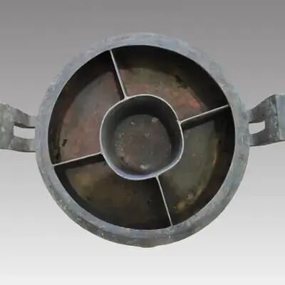 以四块隔板与一件圆筒将整个鼎内分为五块独立区域,这不就是古代的鸳鸯锅吗?不同食材分格来煮,绝不串味主打就是一个:讲究!