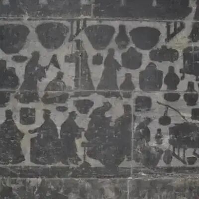 没有相机咋记录?画下来,刻下来!那不比咔嚓拍个照更深刻吗?在临沂五里堡汉画像石——《庖厨图》中,一个人一手烤串,一手扇风,这就是现代的烧烤啊。
