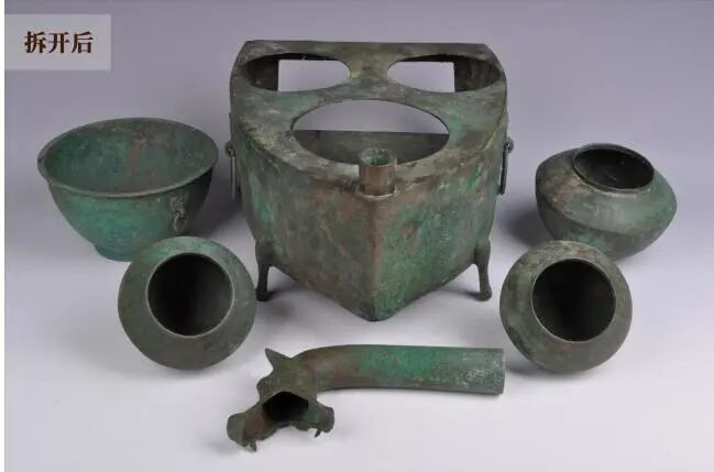 除了美观,这青铜灶还很便利。这是可拆装结构的移动灶,开六个组件,可以快速带走,组装上可以高效做饭,非常适用于行军或游牧。