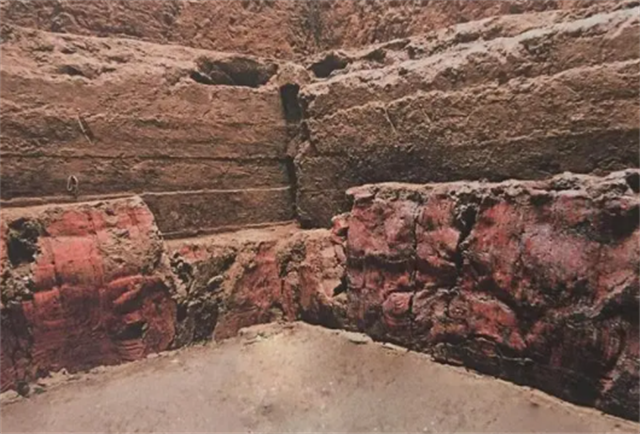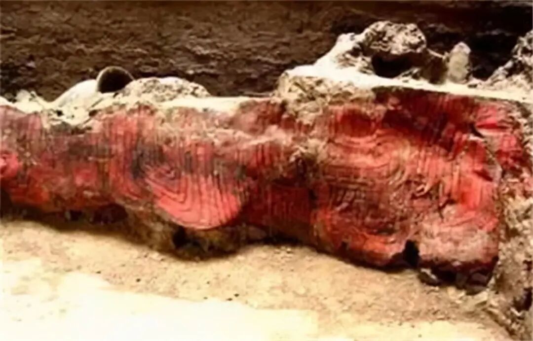 在倗国夫人的墓穴中,考古人员发现椁室北部内壁上有一段鲜红色的带有图案的类似于纺织品的东西露出。