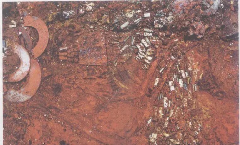 虽然时间久远,但表面上排列整齐的平行线仍旧清晰可见,考古人员认为,这一排排平行线就是刺绣。除这一排排的平行线之外,织品外表面还有非常精美的刺绣图案,依稀可见凤鸟造型等。 荒帷的附近散落着大量的玉、石、蚌质小戈、小圭,可能原来被挂缀在荒帷上或者附属棺饰上。