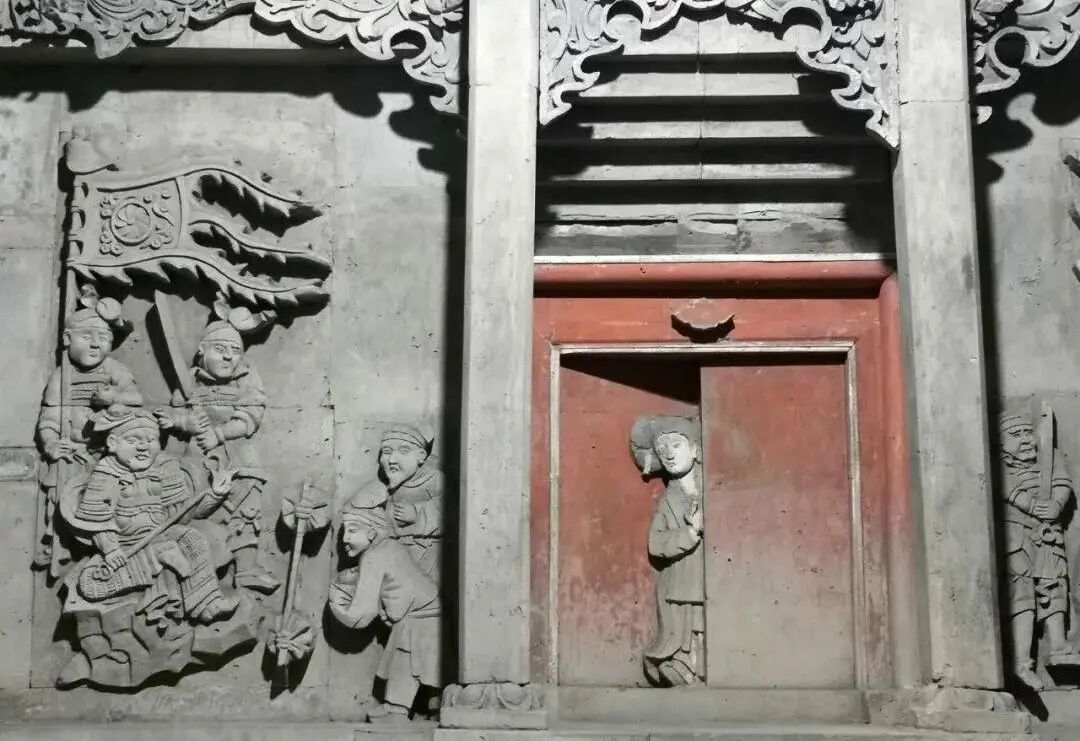 因为雕工太好,这些砖雕还吓坏了人,在标号为2号的墓葬中,有一处妇人启门图,朱红大门半开半掩,一妇人向外张望。可以想象,当年人们重启这座尘封百年的墓葬,在晦暗的光线下,一扇半开的门里隐约探出半个身子,高髻女子正向你挥手微笑……