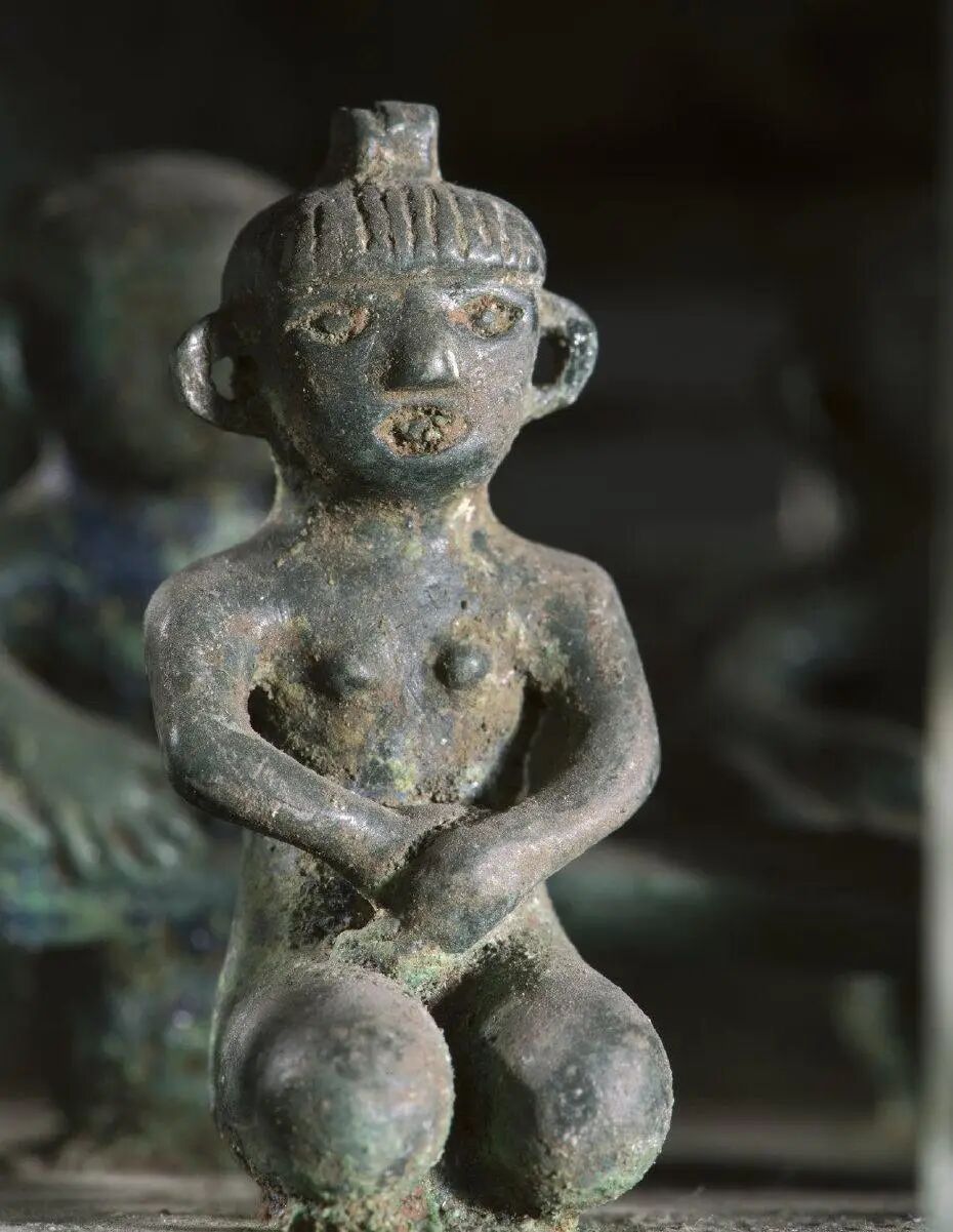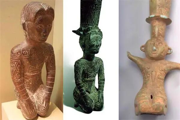不仅如此,这些小姐姐还很可能是有文身的,从考古发掘来看,越人纹身主要包括额头的“雕题”和上肢的“错臂”,当然也不乏纹满全身的。例如,在同一墓葬中出土的镇墓兽器座,就能看到越国人对满身文身的痴迷。《史记》里,也对越人有这样的记录:文身断发,披草莱而邑焉。