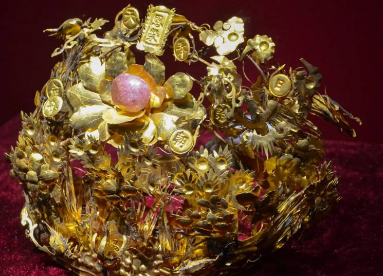 我们不如仔细看看毕沅与妻子合葬墓中出土的随葬品。在妻子汪德的墓中,人们发现了一顶华贵的头冠,这正是诰命金冠。这顶金冠以纯金制成,总重616.4g,中嵌碧玺,饰金凤九只,点缀以花卉,又有“恩荣”、“日”、“月”、“奉”、“天”、“诰”、“命”、“朝”、“冠”字样金牌,是一顶十分罕见的乾隆时期诰命金冠实物。
