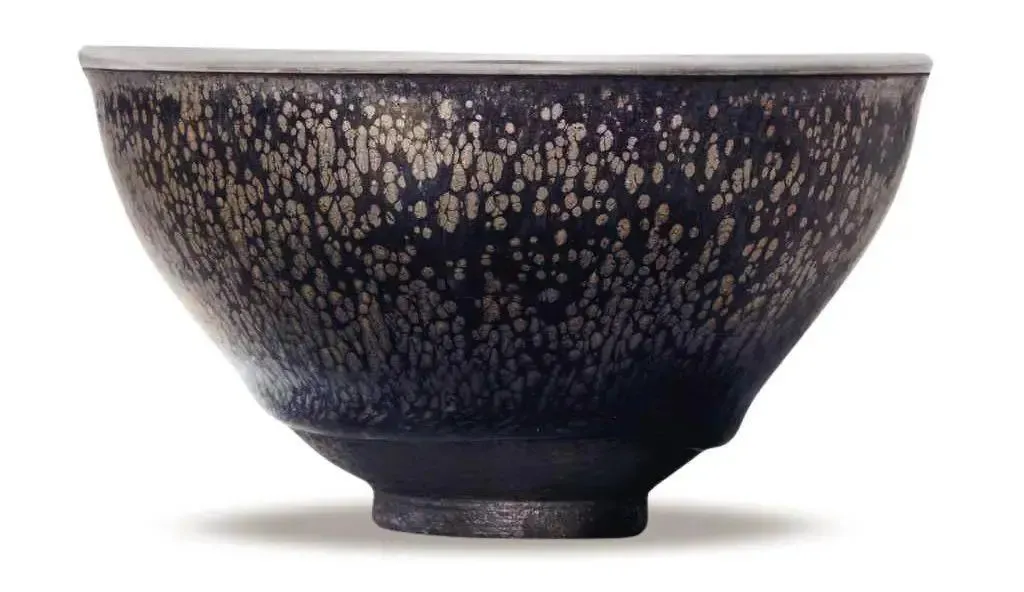油滴盏,它的油滴斑点可大可小、疏密不一,是随机而生,在宋代称为鹧鸪斑。流传到日本后,被日本人称为油滴天目。“油滴”一词在日本应永年间(公元1394-1427年)的《禅林小歇》一书中首次出现。宋代建窑烧制油滴,全靠窑工的火候把握,难度非常高。因为度低了油滴出不来,温度高了就变成了兔毫。公开的传世宋代建窑油滴盏完整器,全世界不超过20件。日本的一本文献《君台观左右帐记》里记载:建盏之“曜变”,世上罕见,值万匹绢。“油滴”是次之,亦为重宝,值五千匹绢。“兔毫”值三千匹绢。