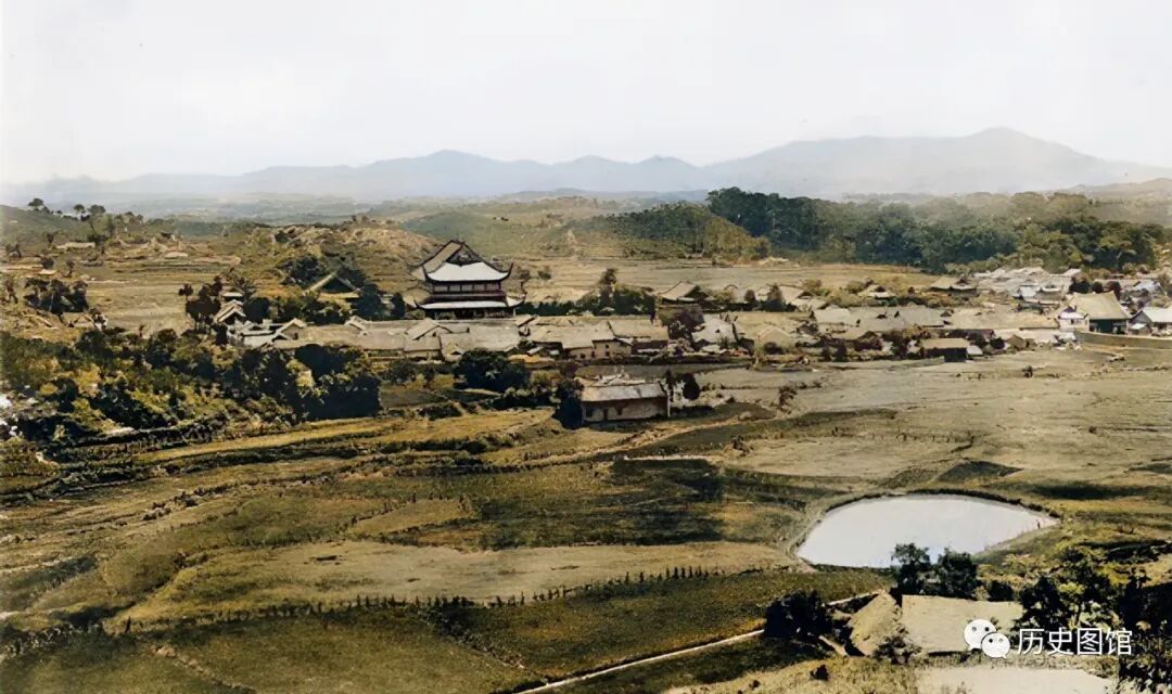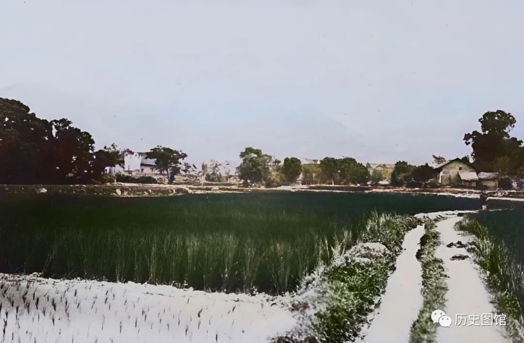 1930年,南岳御坊街附近的村落。村子不大,几间民房散落在绿树丛中。在村子的旁边,是大片的稻田,水稻长势良好,绿油油的。