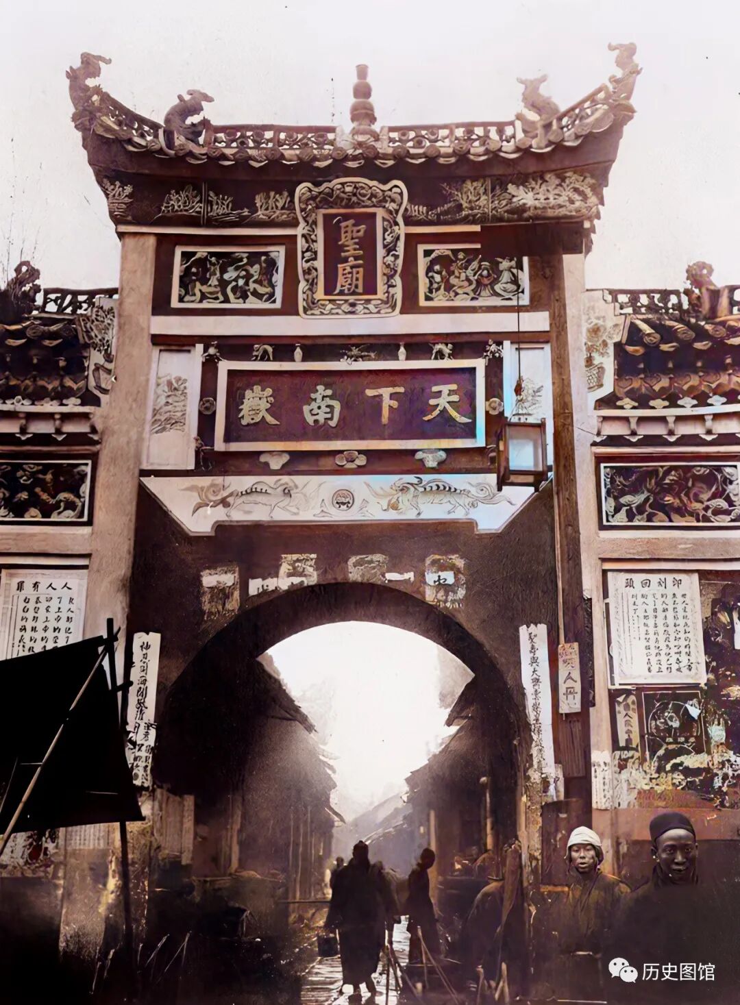 1930年,南岳庙牌楼前的情景。牌楼雕梁画栋,题额四个大字“天下南岳”,上发过牌匾上有“圣庙”二字。牌楼下是一条繁华的小街道,很有生活气息。