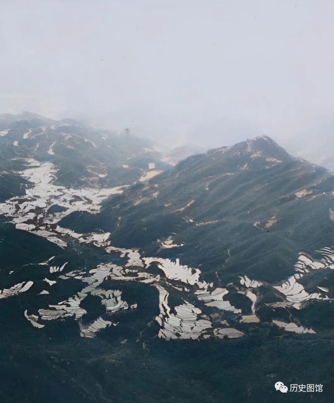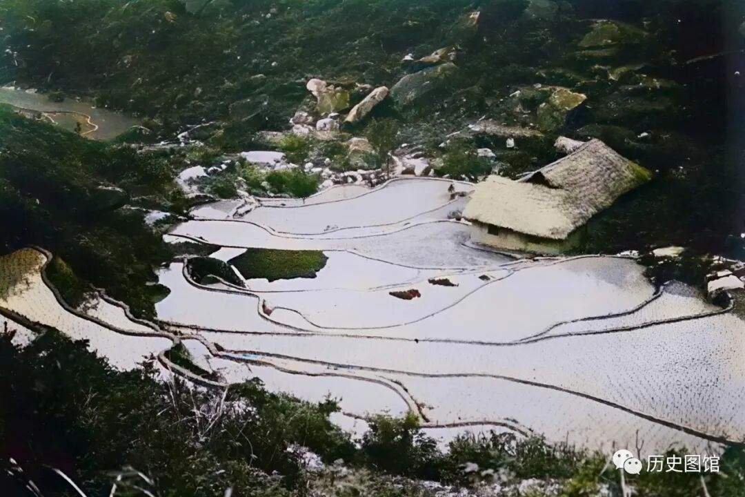 1930年,衡山山谷中成片的梯田,非常壮观。一块块不规则的注满水的稻田,犹如闪亮的镜片,镶嵌在青山上。从这个角度看过去,十分漂亮。