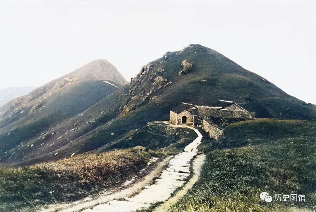 这是位于衡山的南天门。南天门,是南岳前后山的分水岭,古人称之为人间与仙境的分界线。照片中,一条石板路旁边有一所古寺。远处,青山连绵不绝。照片拍摄于1941年。