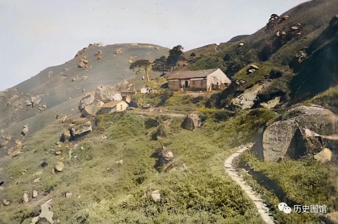1944年,衡山狮子泉附近风光。在半山腰上有一条石板小路,沿着山势蜿蜒曲折。在小路的旁边,竟然有一座房屋,看外观像是一座小庙。