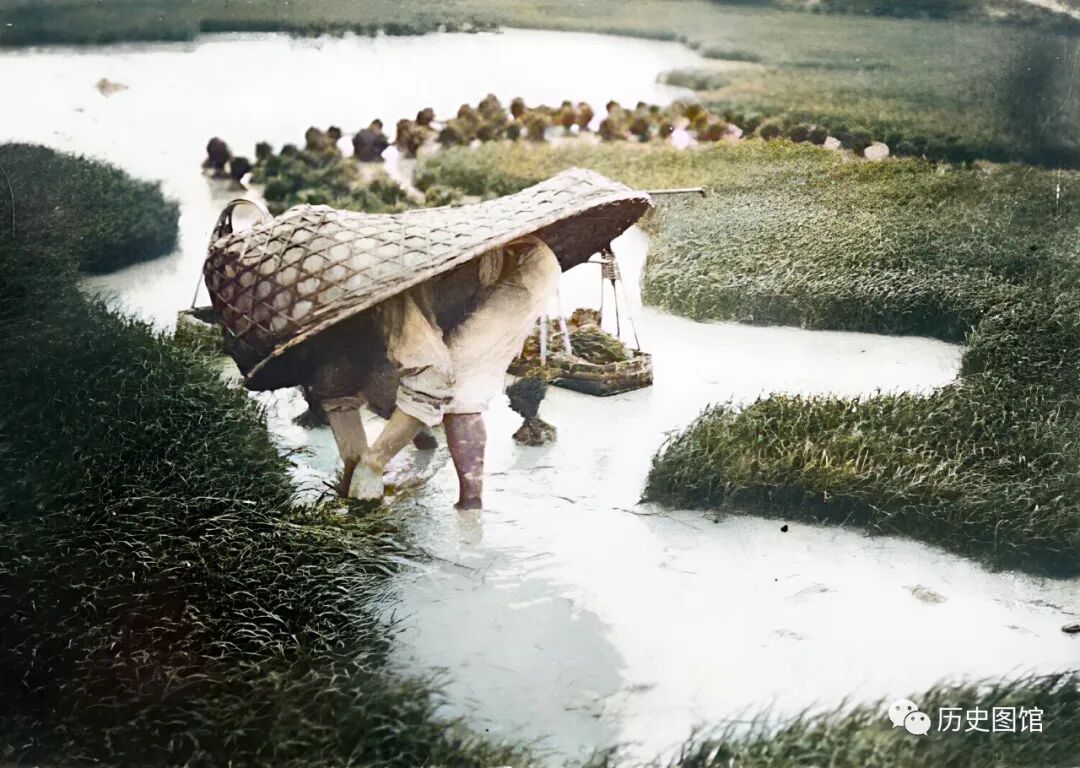 不远处,是一捆捆绑扎好的水稻秧苗。它们将会被运送到稻田里,一棵棵插进水田里,等待丰收的时刻。照片拍摄于1930年。