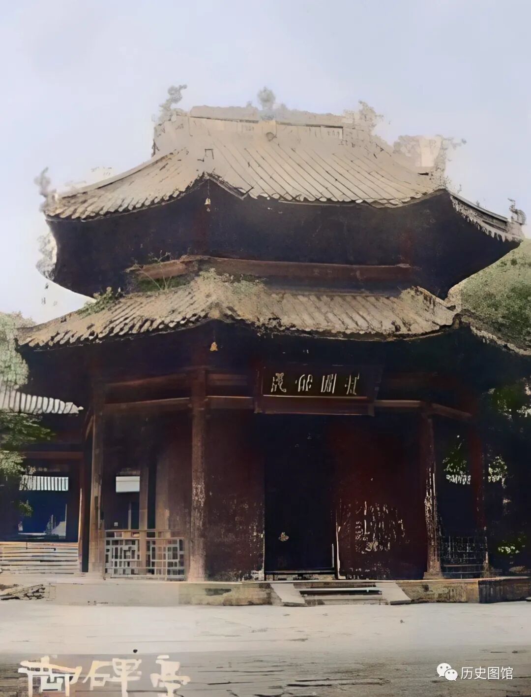 这座建筑,是南岳庙内的御书楼,保存了宋代和明代的建筑构件,御书楼是南岳庙内第六进建筑。门前台阶镶嵌一块石刻龙陛,很珍贵。照片拍摄于1944年。