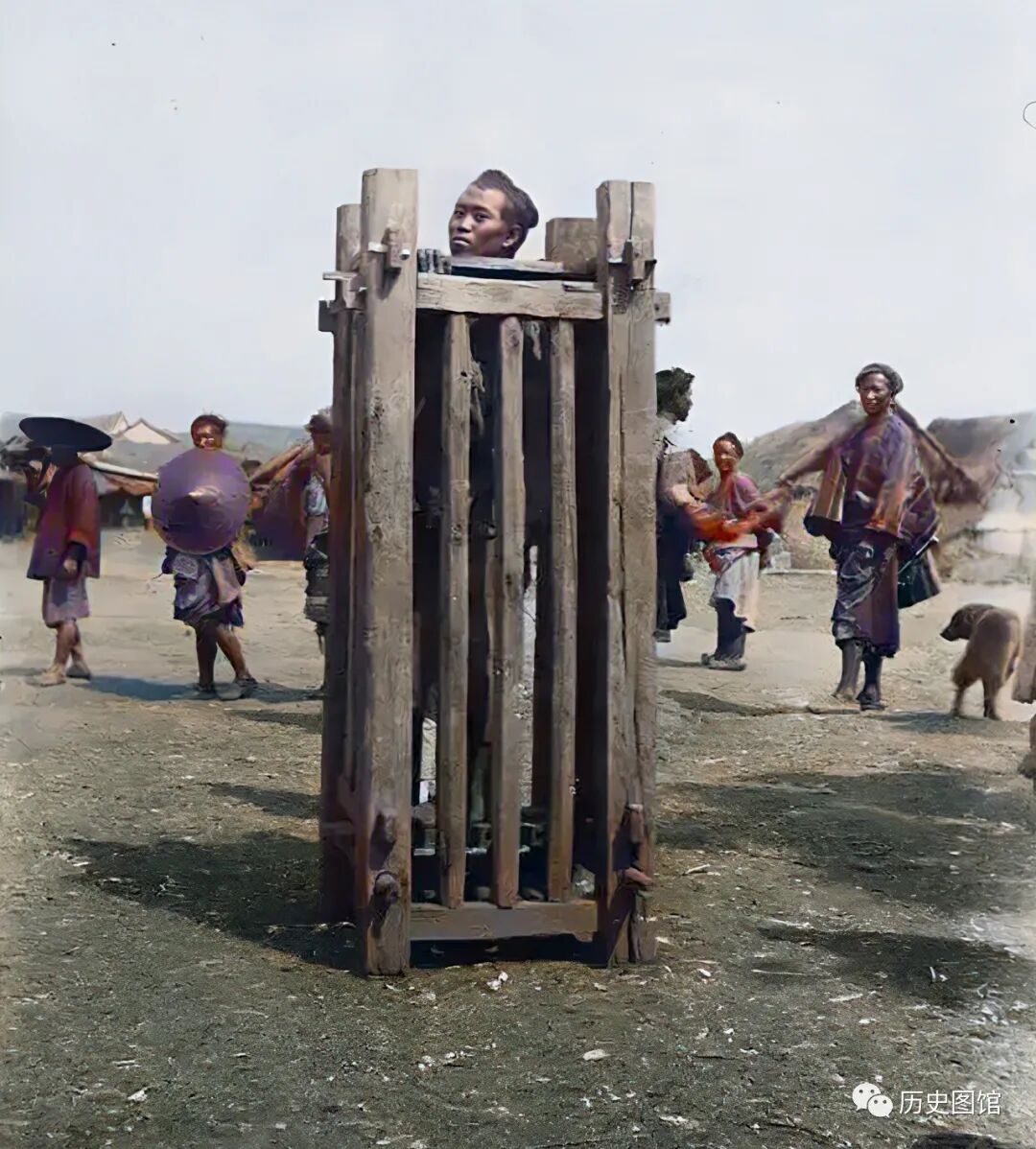 罪犯被关在木笼里示众,木笼下面有垫脚的隔板。如果抽掉隔板,罪犯就会双脚悬空,脖子卡在木笼上部,有些犯人会在站笼中活活吊死。