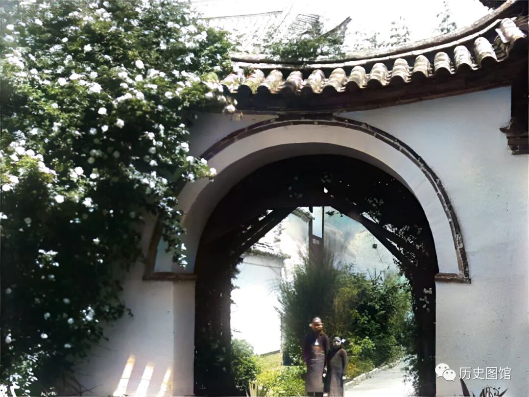 1917年,云南腾冲一处仿古拱门,粉墙黛瓦,白色的蔷薇花开得正盛。一名男子带着孩子在这座花园里游玩。