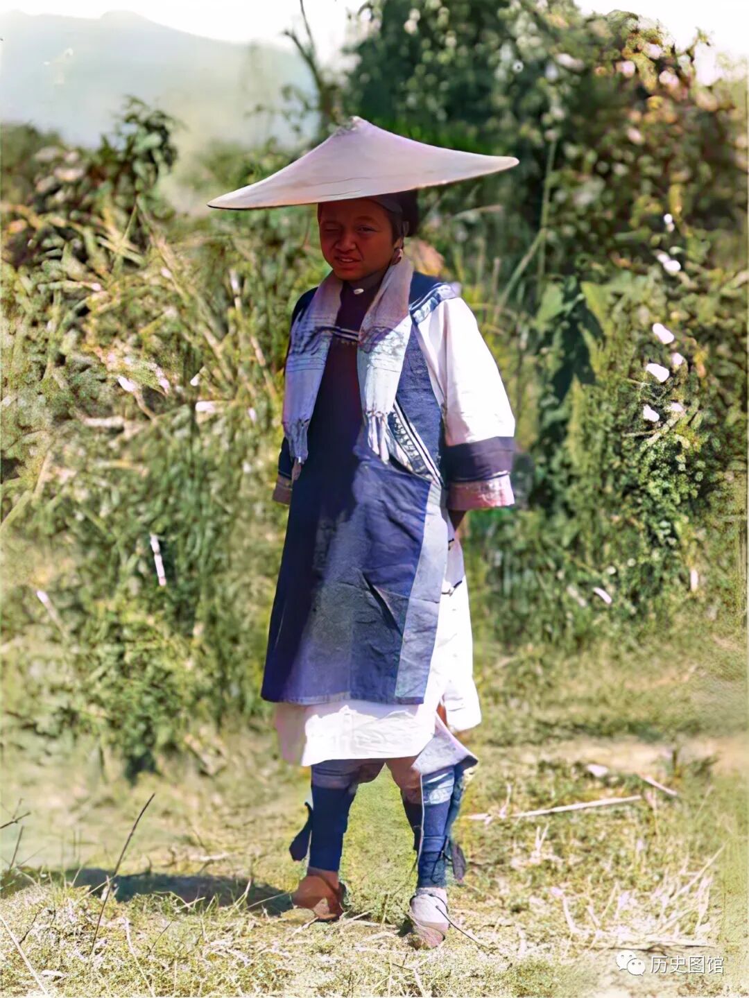 一名年轻的女子,身穿漂亮的民族服装,头上戴着斗笠,可能是去参加自己民族的节日活动。面对摄影师的镜头,她把双手背在身后。