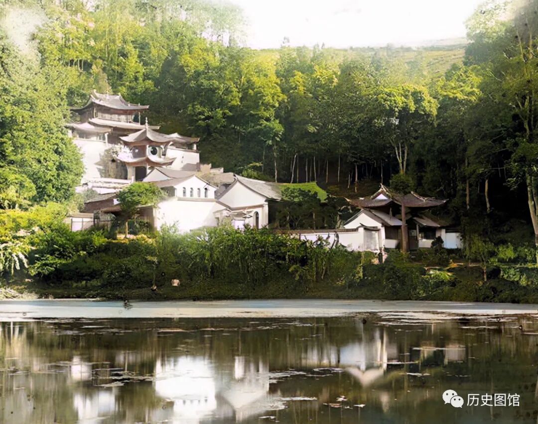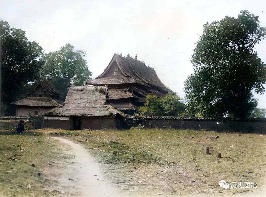 1917年,云南腾冲的一座寺庙。建筑颇具云南当地风情,粗竹子做房子的骨架,竹编篾子做墙体,楼板或用竹篾,或用木板,屋顶铺草。寺庙规模不大,四周有围墙,院内树木参天。门前有一条小路,当时的香客络绎不绝。