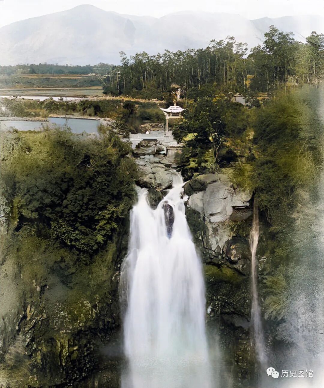 1917年,腾冲叠水河瀑布壮观景象,瀑布犹如一条洁白的布,从46米高的崖头处垂下来,水声震耳欲聋。被誉为“龙洞垂帘”的叠水河瀑布,是“腾冲十二景”之一。