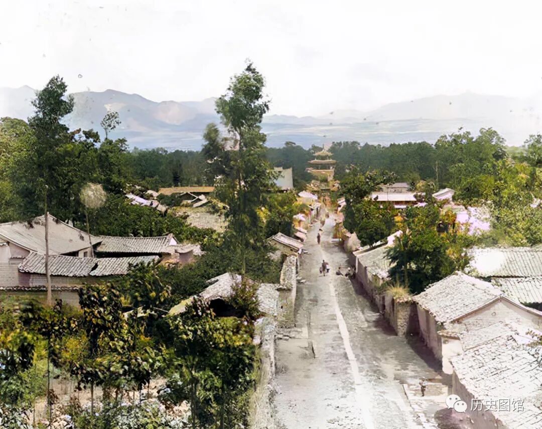 1917年,云南腾冲城内的景象。街道宽敞笔直,道路尽头那座高大的建筑就是文星楼。大街两侧是一排排的民居和院落,掩映在绿树丛中很有诗意。