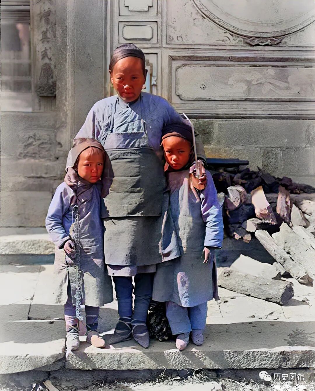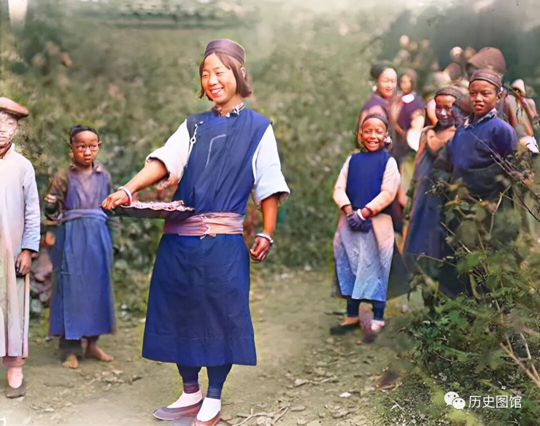 1917年,云南腾冲当地的一面名女子,带着自己的两个孩子站在一座寺庙门前,左手拿着一个水烟壶。面对摄影师的镜头,两个孩子显得有些害怕,他们拘谨地藏在母亲的胳膊下面。