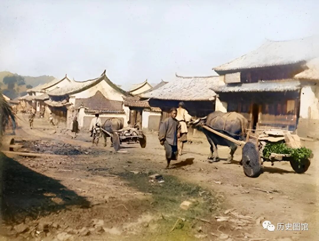 1917年,云南腾冲的一条街道。道路为土路,低洼处还有泥泞的水坑。路两旁的建筑灰瓦白墙古色古香。两名车夫赶着牛车从街上走过,马车的轮子还是木头的。在小街的尽头,能依稀看到远处连绵不断的青山。