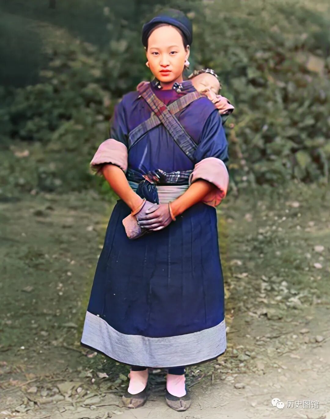 1917年,云南腾冲一名年轻女子站在路旁。她长相漂亮,身上穿着传统的民族服装,背上的孩子已经睡着了。