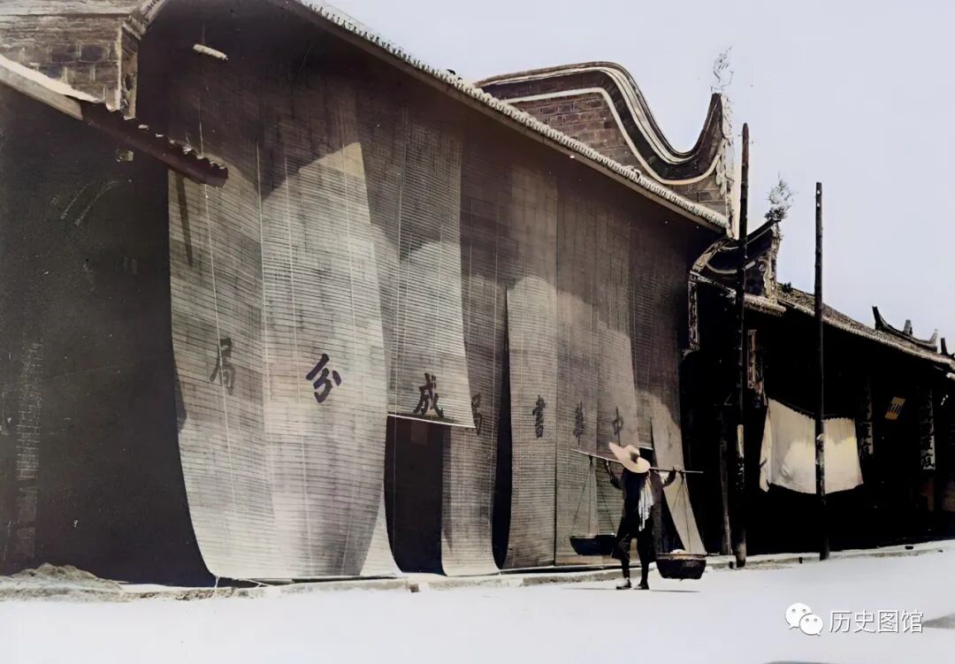 1930年,位于成都春熙路上的中华书局成都分局。古色古香的建筑,外面垂下几条遮阳的竹帘,帘子上写着“中华书局成都分局”字样。一名男子挑着箩筐,从门前走过。