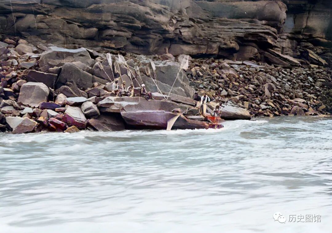 在岷江边上,一些渔夫站在岸边的大石头上,用手里带有长杆的渔网捕鱼。岷江水十分湍急,渔夫们捕鱼时都十分小心。在他们身后,是巨大的山体和碎石。照片拍摄于1938年。