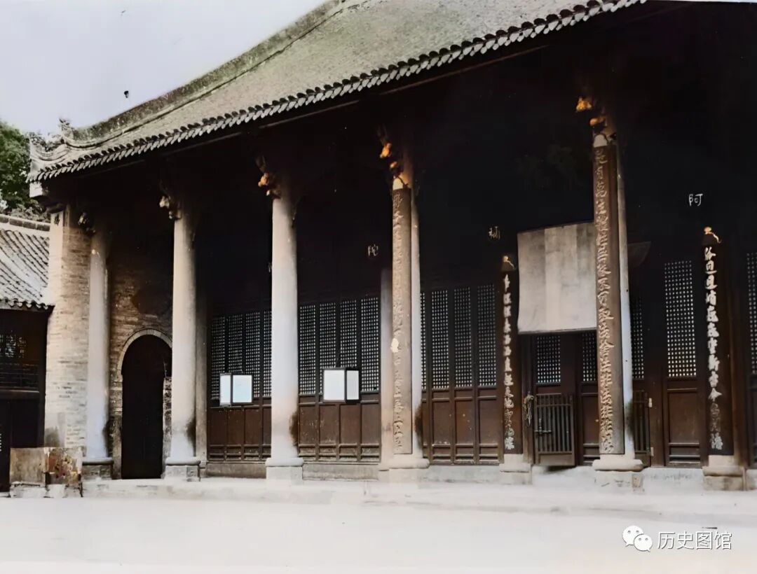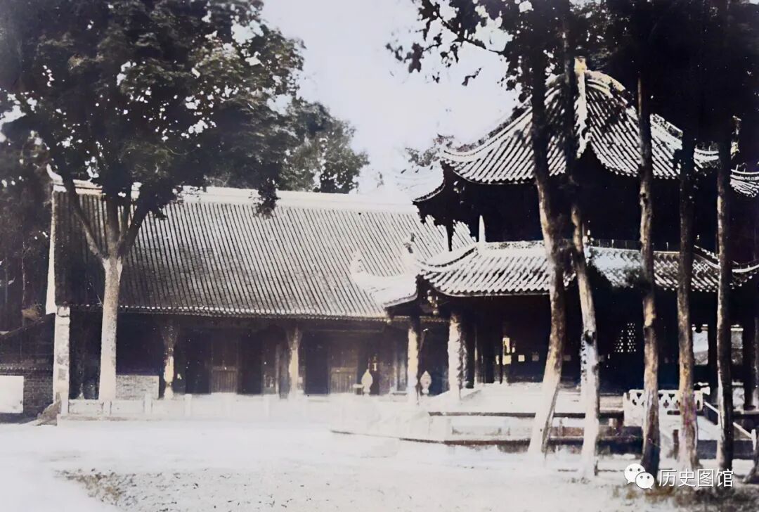 30年代,位于成都的刘备惠陵景象。这是寝殿,建筑面阔三间,宽11米,进深8米,灰青筒瓦屋顶,建筑简朴庄严。殿内高悬清人马维骐所书“千秋凛然”四字匾额。