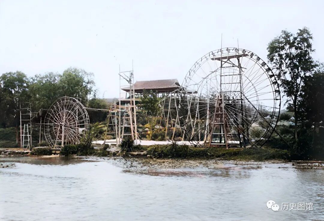 这是位于成都郊外河边的水车。巨大的圆形轮盘不断转动,将河水提灌到高处的农田里。这种水车,比传统的人力灌溉要先进很多。在上世纪六七十年代,在一些偏远地区,还能见到这种水车的影子。照片拍摄于1930年。