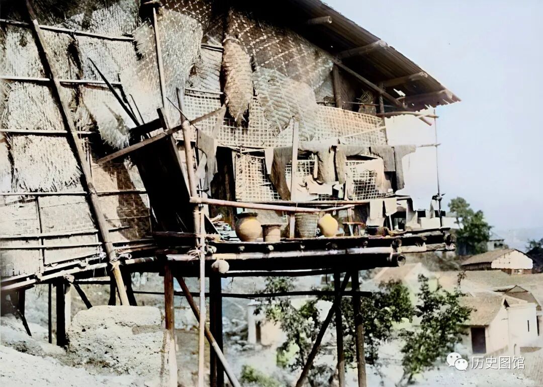 1930年,成都郊外的一座客栈。这座客栈建在岩石之上,是一座吊脚楼。客栈用木头、竹子和席子搭建而成,十分得简陋。门口的平台上,摆放着陶罐、竹篓等生活用品。