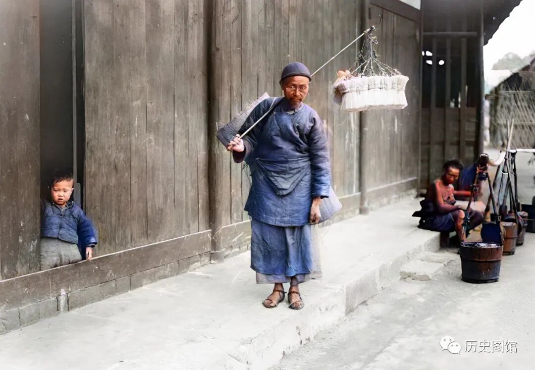 30年代,一名男子走过成都的街头。他是一名流动小贩,扛的棍子上挂着待售的小商品。在他背后,还斜挎着一张苇席。白天走街串巷卖东西,晚上睡在随身携带的席子上。