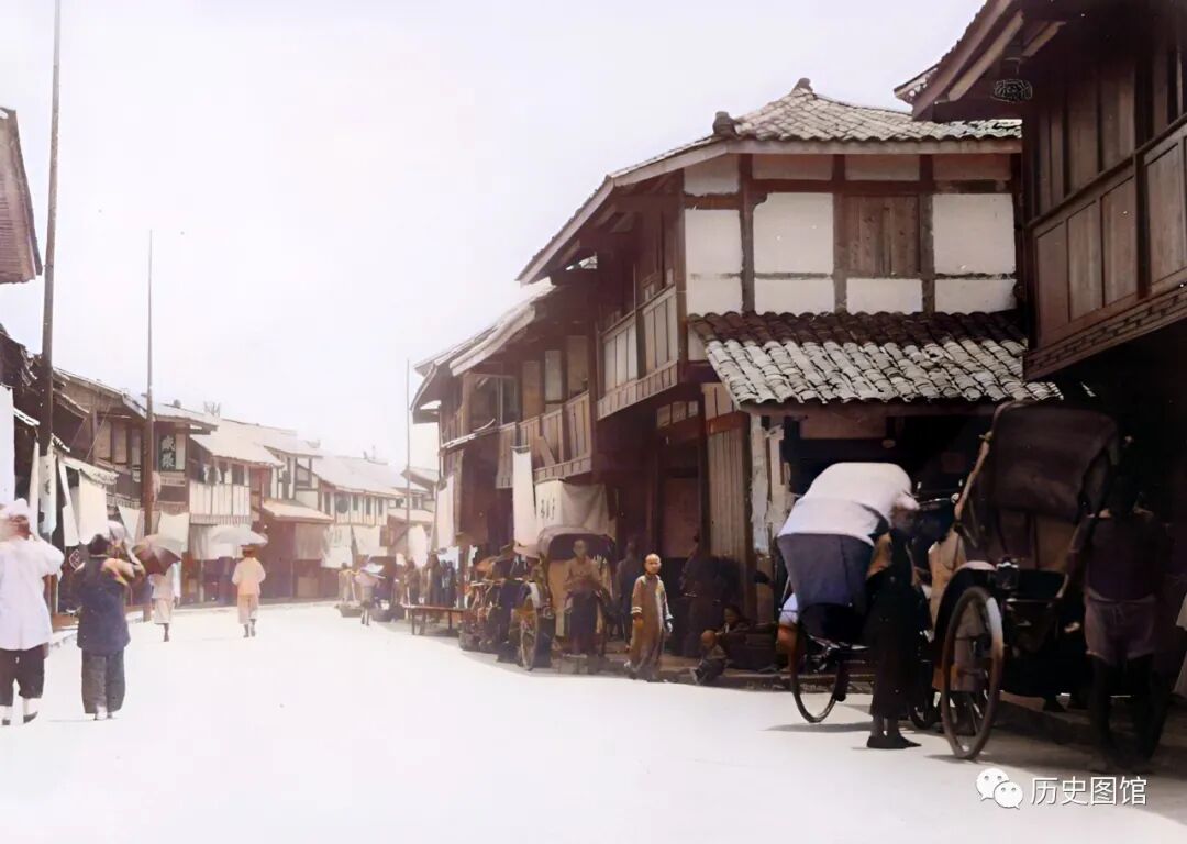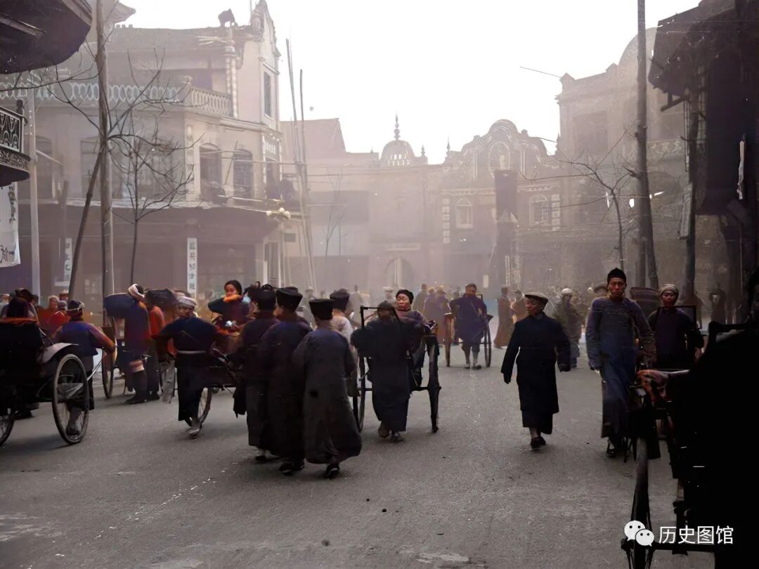 30年代,成都街头景象。正午的阳光很明亮,街道两侧建筑古色古香,沿街店铺都在开门营业。一些黄包车师傅在阴凉处等待载客。