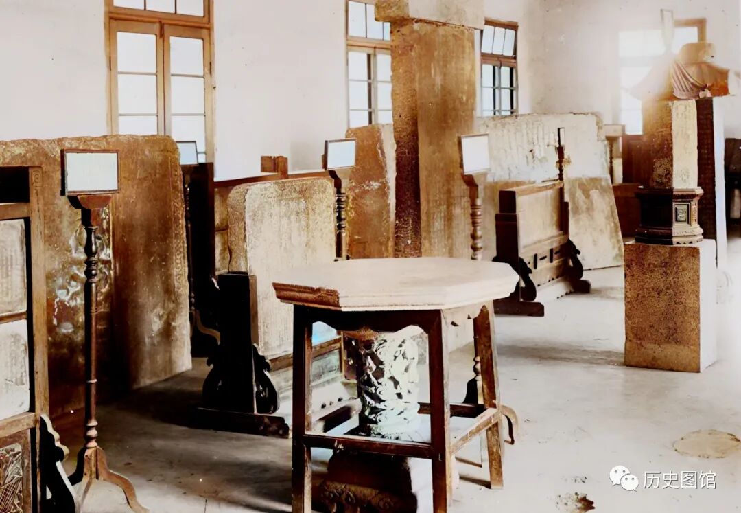 这是1937年成都博物馆内的景象。在一个十分宽敞明亮的房间里,摆放着一些古代的碑刻、石柱、古镜等文物。这些碑刻还专门放置在特制的木架子上,保护措施做得很到位。