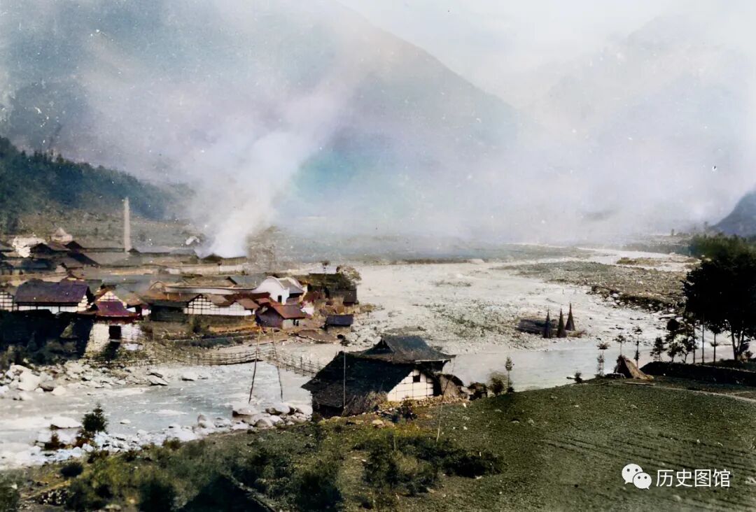 1939年,位于彭州的白水河铜冶炼厂。峡谷之中的白水河滩上,厂房里正冒出白烟。河面之上,还有一座吊桥,连接厂区和岸边。远处的青山在烟雾中时隐时现。