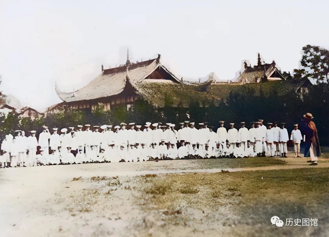 1939年,位于成都郊外的一所学校。学生们穿着整齐的军装,正在操场里合影留念,背后的校舍是传统的古典建筑。身穿长衫的摄影师站在前面指挥,学生们按个子高低排成两排。