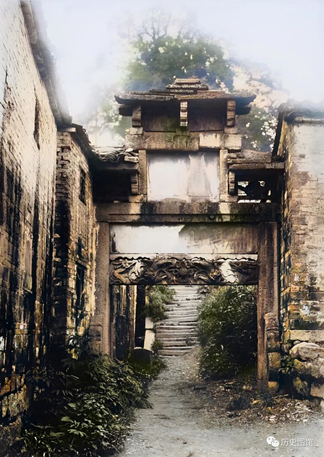 牌楼的题额雕刻着“高山仰止”四个大字。两侧楹联为:千载良知传道脉,九华宴坐见天心。透过牌楼下的门洞,能看到正沿着山势上升的石头台阶。如今,这座牌坊已不存在。