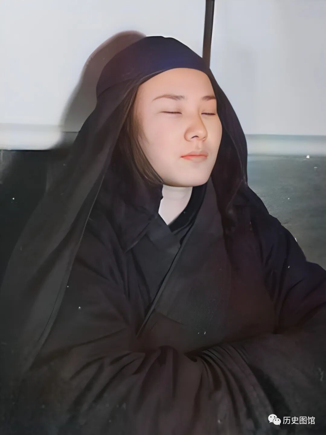 翠峰寺里,一名打坐诵经的女尼姑。她面目清秀,身穿僧袍,头上戴着长头巾,双手插在袖管里,正闭目在心中默默念经。