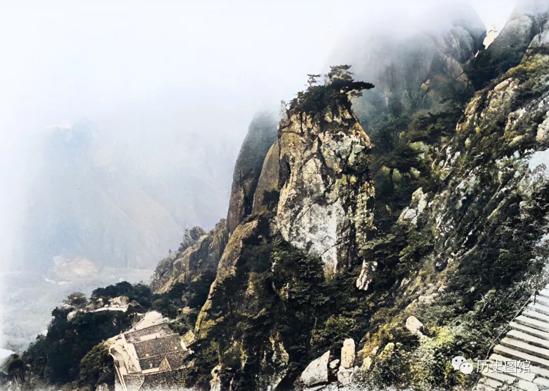 九华山奇峰怪石,风光旖旎。从这里沿着台阶往上走,就登上了九华山主峰天台峰。近处,山峦起伏,巨石耸立。远处,山峰在云雾中时隐时现,好似人间仙境。照片拍摄于1929年。