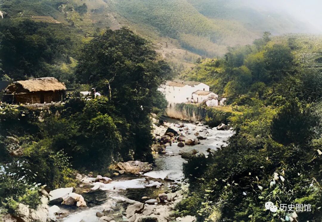 这是九华山山谷中的一条溪流。河两岸是陡峭的崖壁,崖壁之上有一些民房和村落。远处,青山连绵不绝;近处,流水在河底的石头间穿行,好一处山村美景。照片拍摄于1929年。