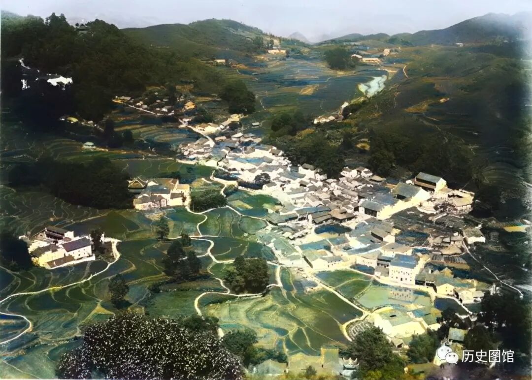 1929年,站在九华山东崖之巅,这里也是百岁宫所在地。站在高处俯瞰山下的美景,令人惊叹。一座座寺院和民居鳞次栉比,一眼望不到尽头。在城外,是大片的梯田,从高处看呈现出深浅不一的绿色块。
