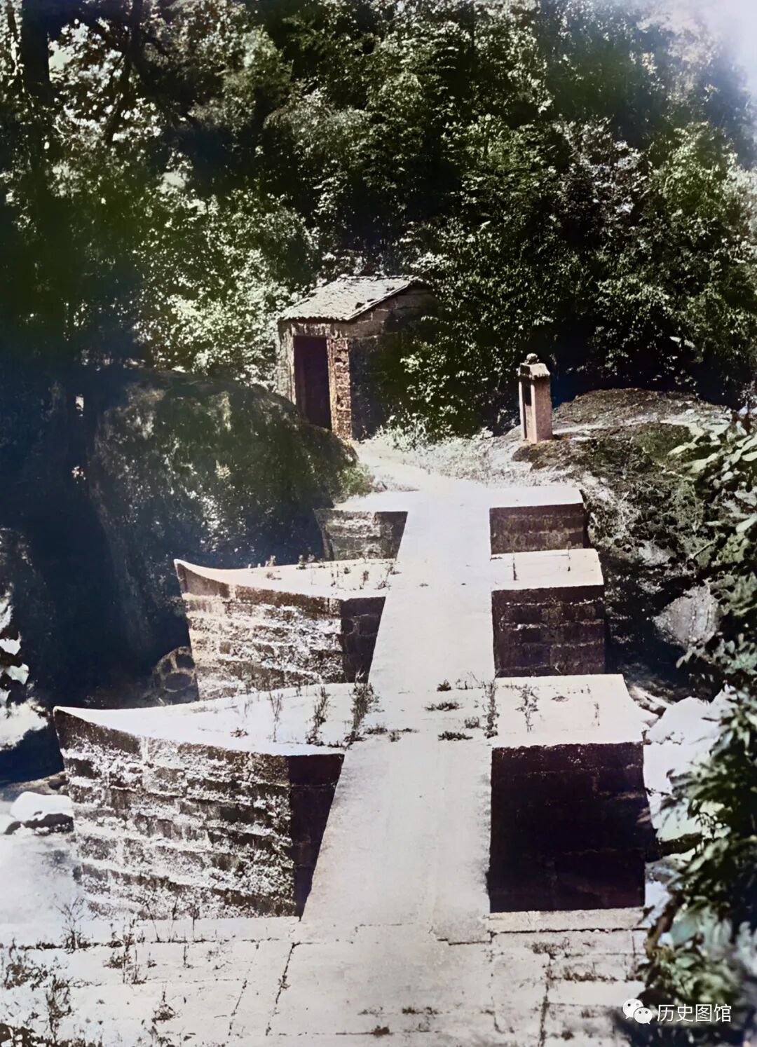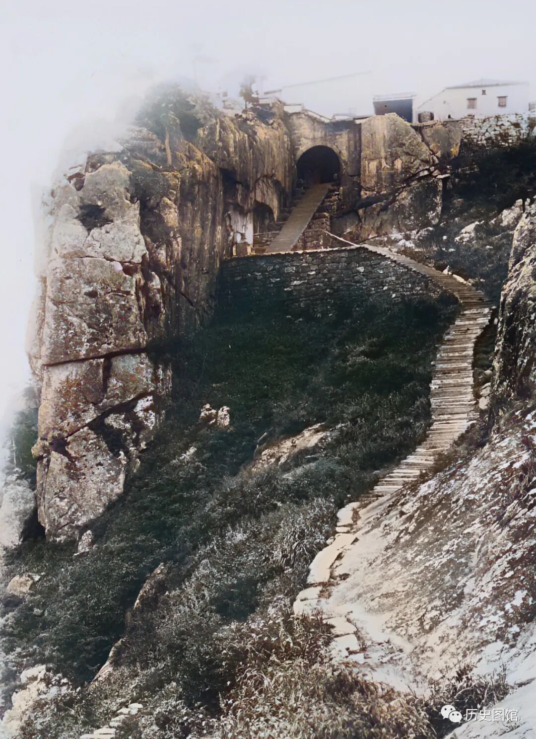 这张照片,也是拍摄于天台峰。一条狭窄的山路蜿蜒曲折,沿着山势向上延伸。一路上到处怪石林立、悬崖绝壁。石梯云折断,松洞水飞还。照片拍摄于1929年。