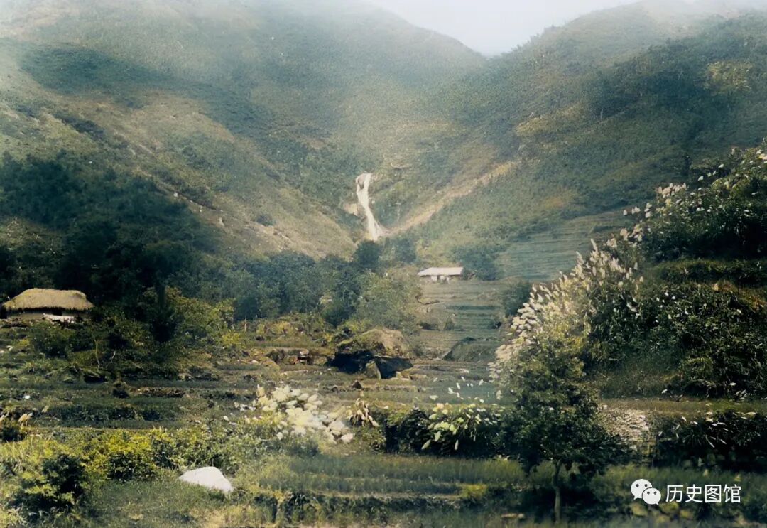 1929年,九华山秋色宜人。远处,在两座大山中间,有一条瀑布,犹如白练垂下来。山谷中还有几户人家的草房。近处,白色的芒草长满了山坡。植被繁茂,瀑飞泉涌,真是太美了!