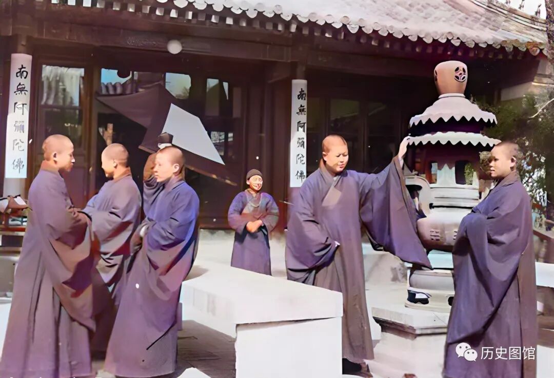 这张照片,拍摄于九华山翠峰寺,照片中几名尼姑在寺内活动。她们身穿僧袍,站在香炉前聊天。身后的大殿十分壮观。